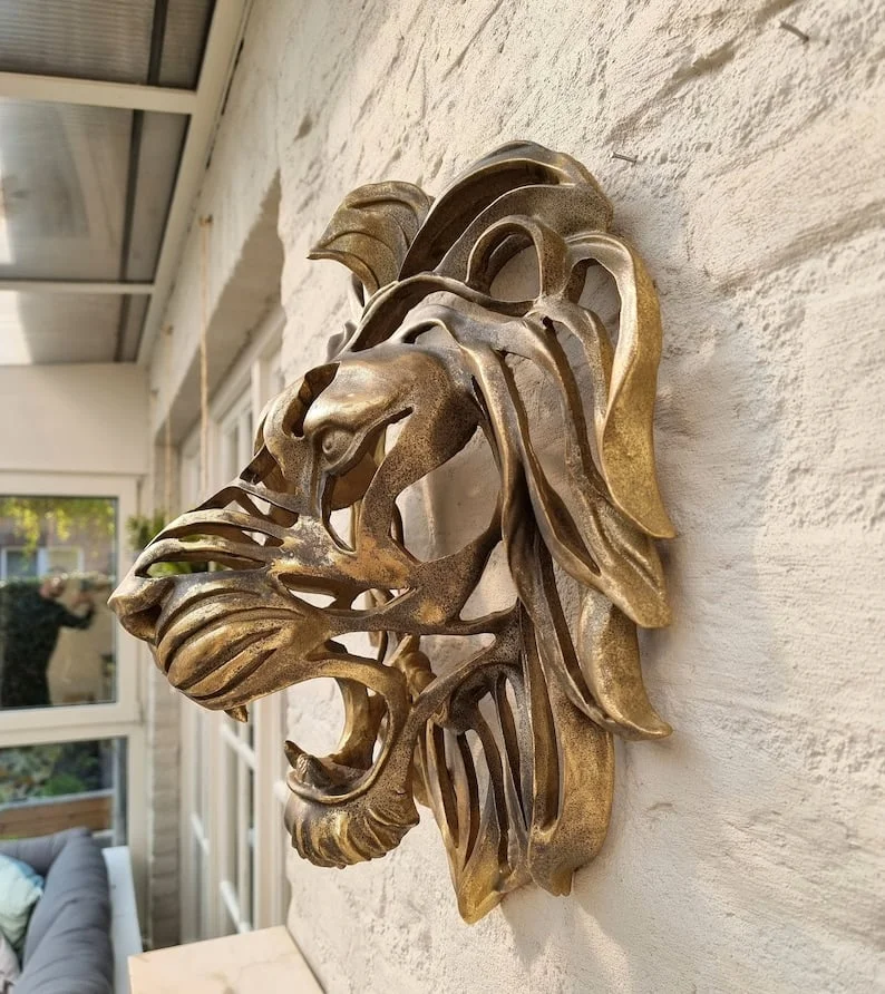🦁Conquer the world or at least your wall with a fierce lion head. Beautifull lion head sculpture for wall mounting. A beautiful piece with a gorgeous metallic look and lots of detail. With a gold coloring.