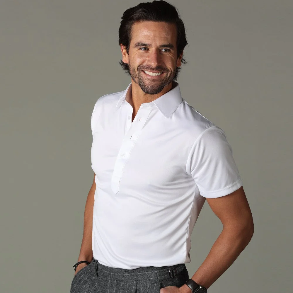 The versatile Semi-Spread Collar Polo. Woven for comfort and designed for style. This shirt pairs a formal semi spread dress collar with an extra comfortable, 4-way stretch, short-sleeved polo. The semi-spread collar has all the benefits of our ever popular English spread collar with a streamlined size and built to accommodate a larger tie knot