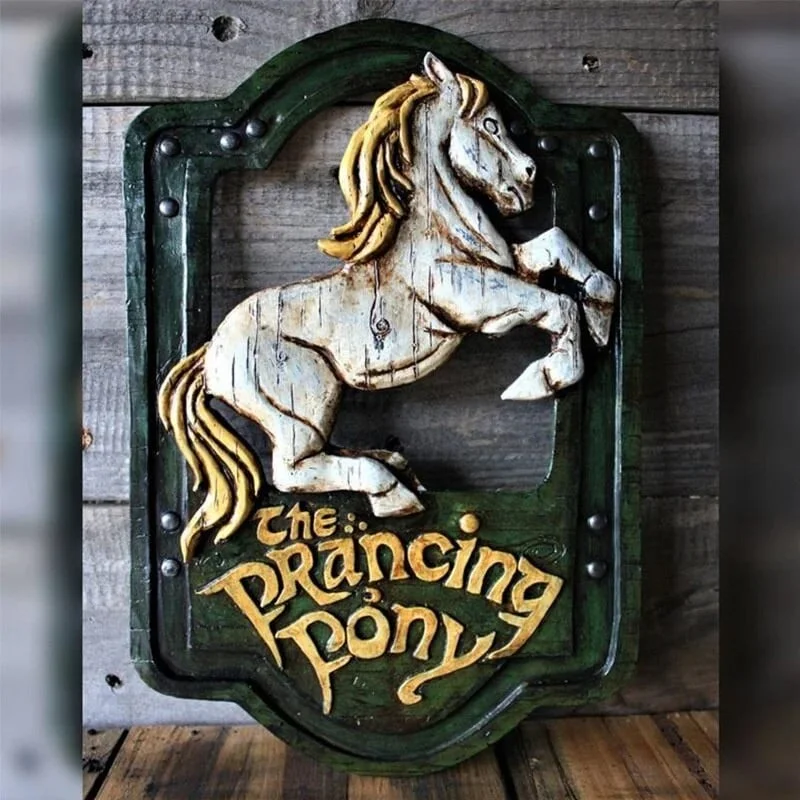 This inspired The Prancing Pony & The Green Dragon Pub Signs Set is highly detailed and weathered to look screen accurate to the sign in the movie. Its the perfect memorabilia to hang in your own bar or house.